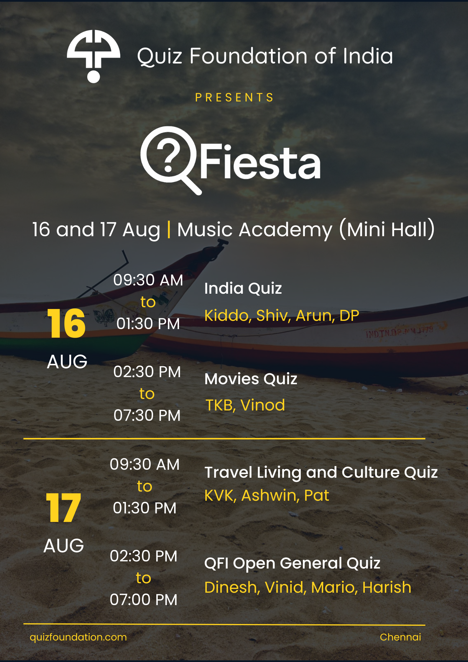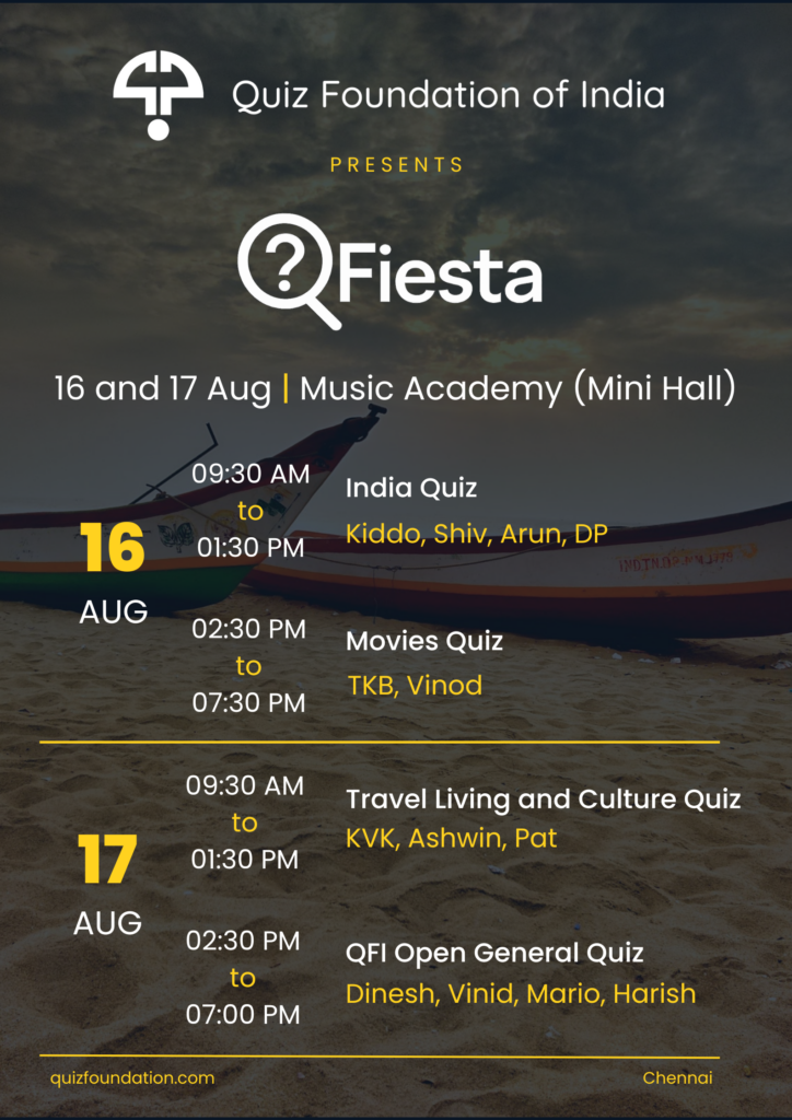 QFIesta, the annual quizzing festival hosted by the Quiz Foundation of India (QFI) is back and we’ve got some swanky new facilities! On the 16th and 17th of August, the Music Academy Mini Hall (Kasturi Srinivasan Hall) will host four quizzes, culminating with our flagship QFI Open General Quiz making a comeback to the QFIesta schedule.