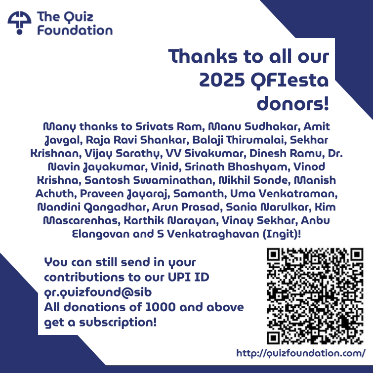 Contributions of Rs.1000 and above will receive a free subscription to our coveted questions mailing list for this calendar year. It would make a great gift to any trivia lover if you are already a subscriber.
